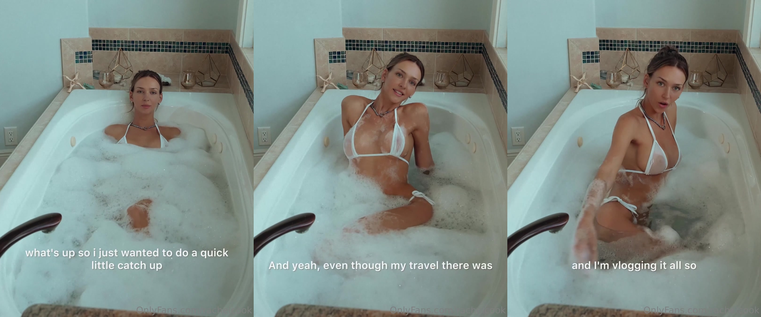 Check out Rachel Cook sporting a barely-there bikini while getting wet and wild in the bathtub in this exclusive OnlyFans video caught on ViralPornHub.