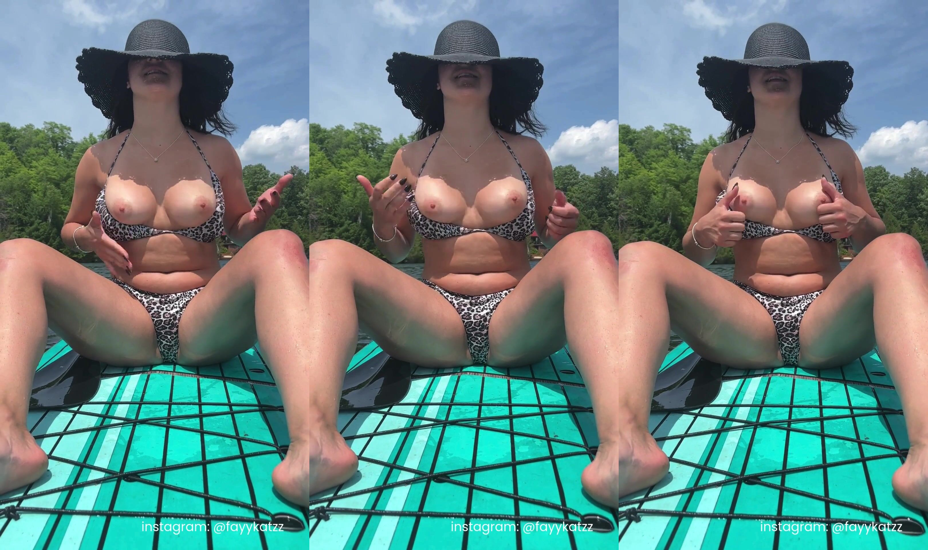 A naughty wife hits the waters in her sexy leopard bikini riding a paddleboard getting herself tanned while teasing her gorgeous tits for all to see