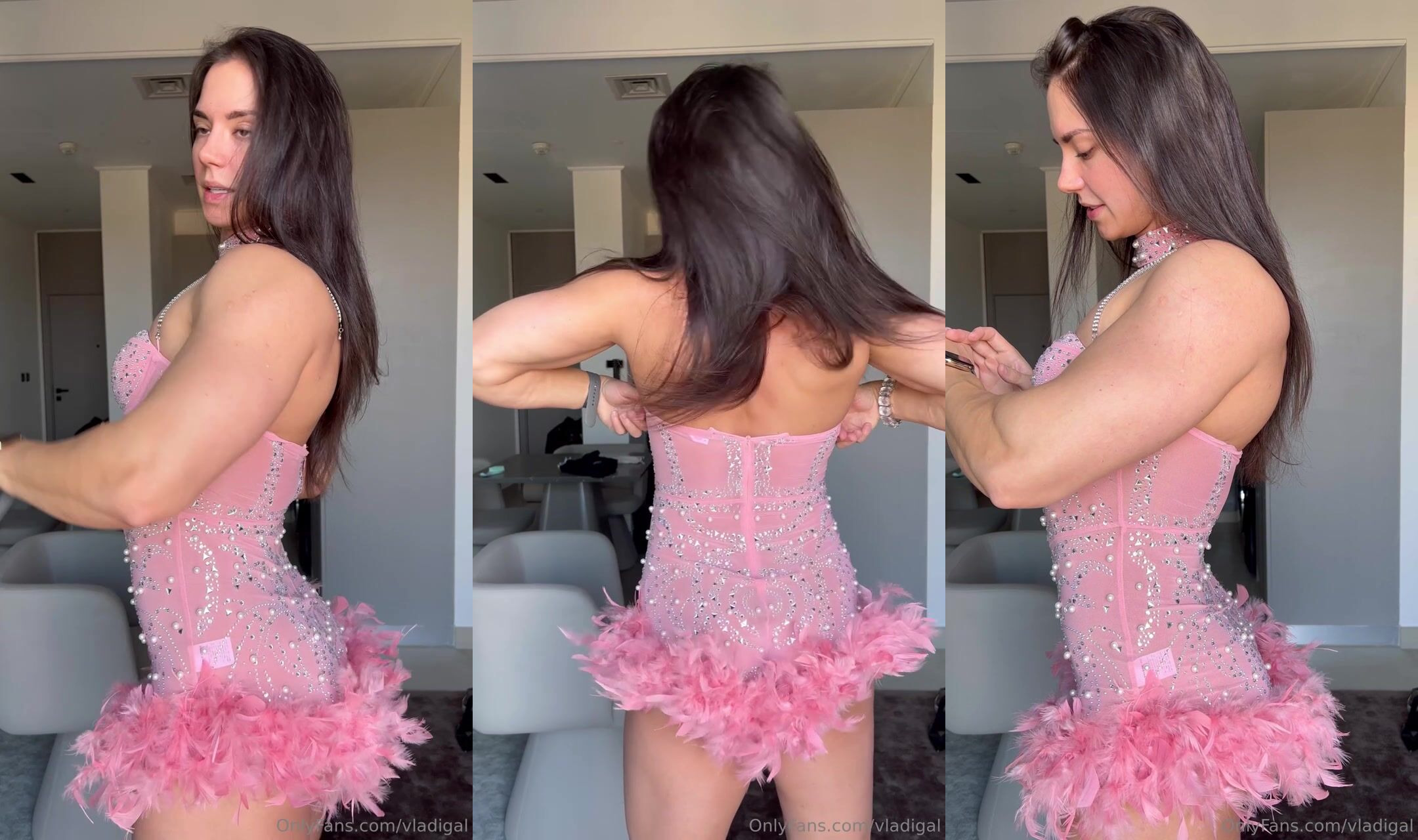A sexy video of Vladigal Try on haul Her Pink Outfit in Front of the Camera