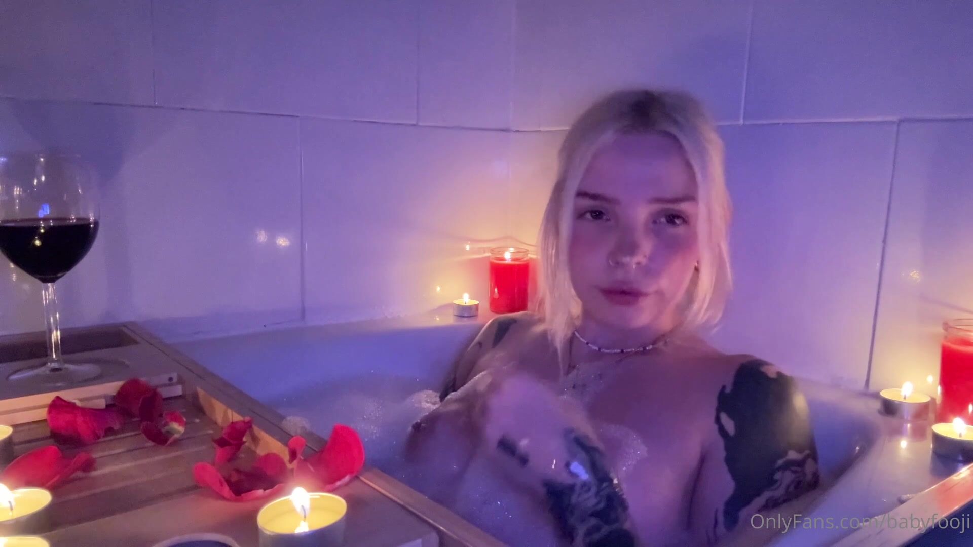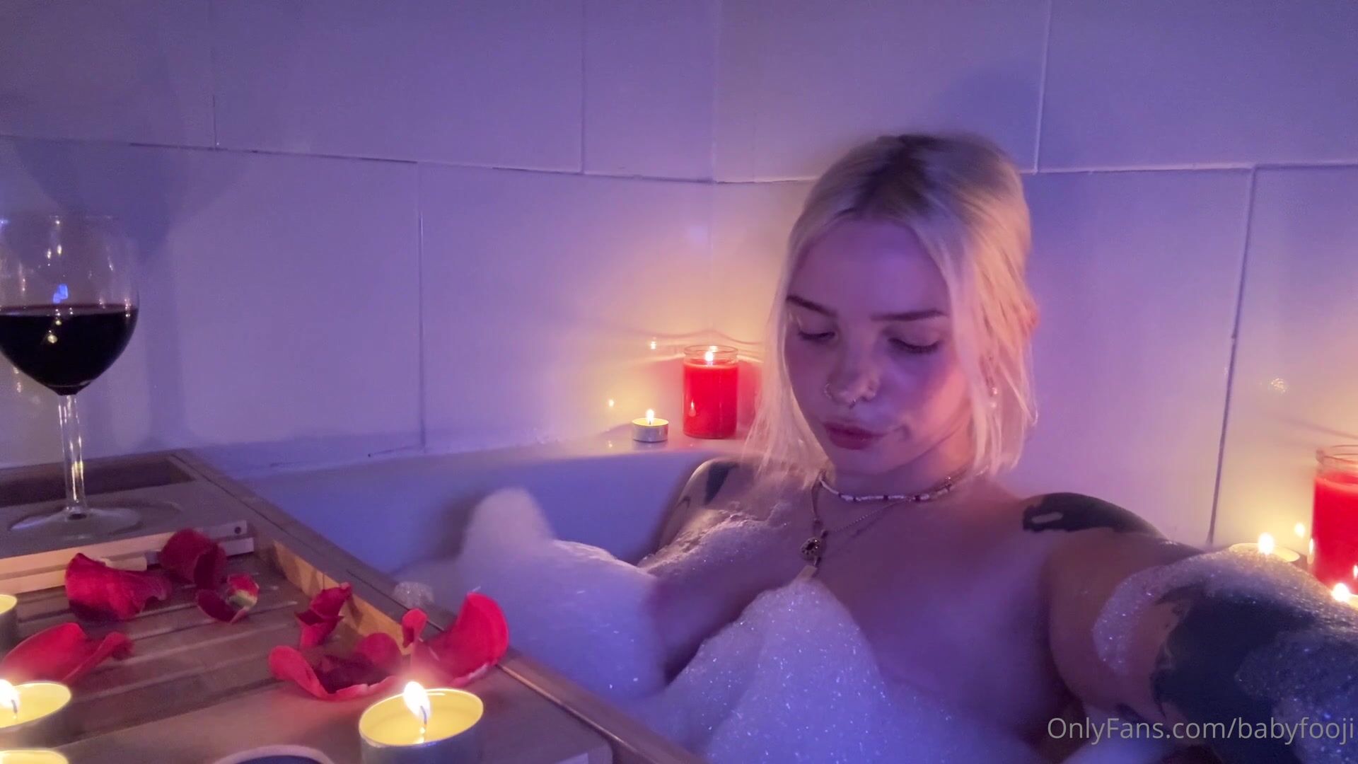 Seductive video of babyfooji enjoying a bubble bath while teasing her perky tits and wet pussy in a romantic candlelit setting.