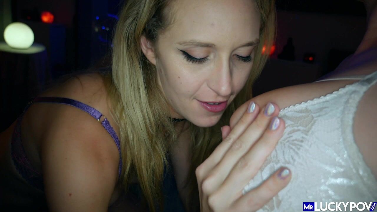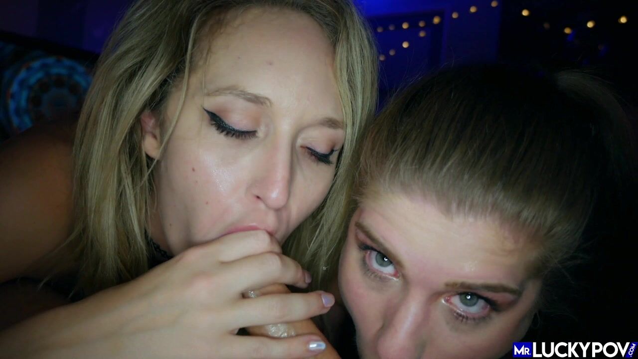 Brunette Ginger Banks and blonde Alex Chance share a cock in this steamy threesome video.