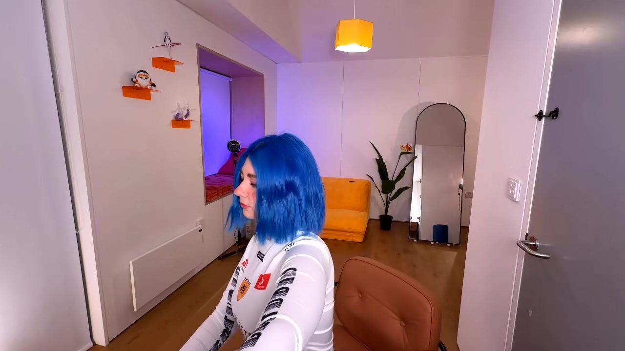 Blue-haired goddess Vixenp teasing with her massive tits in a tight blue outfit during a live stream.