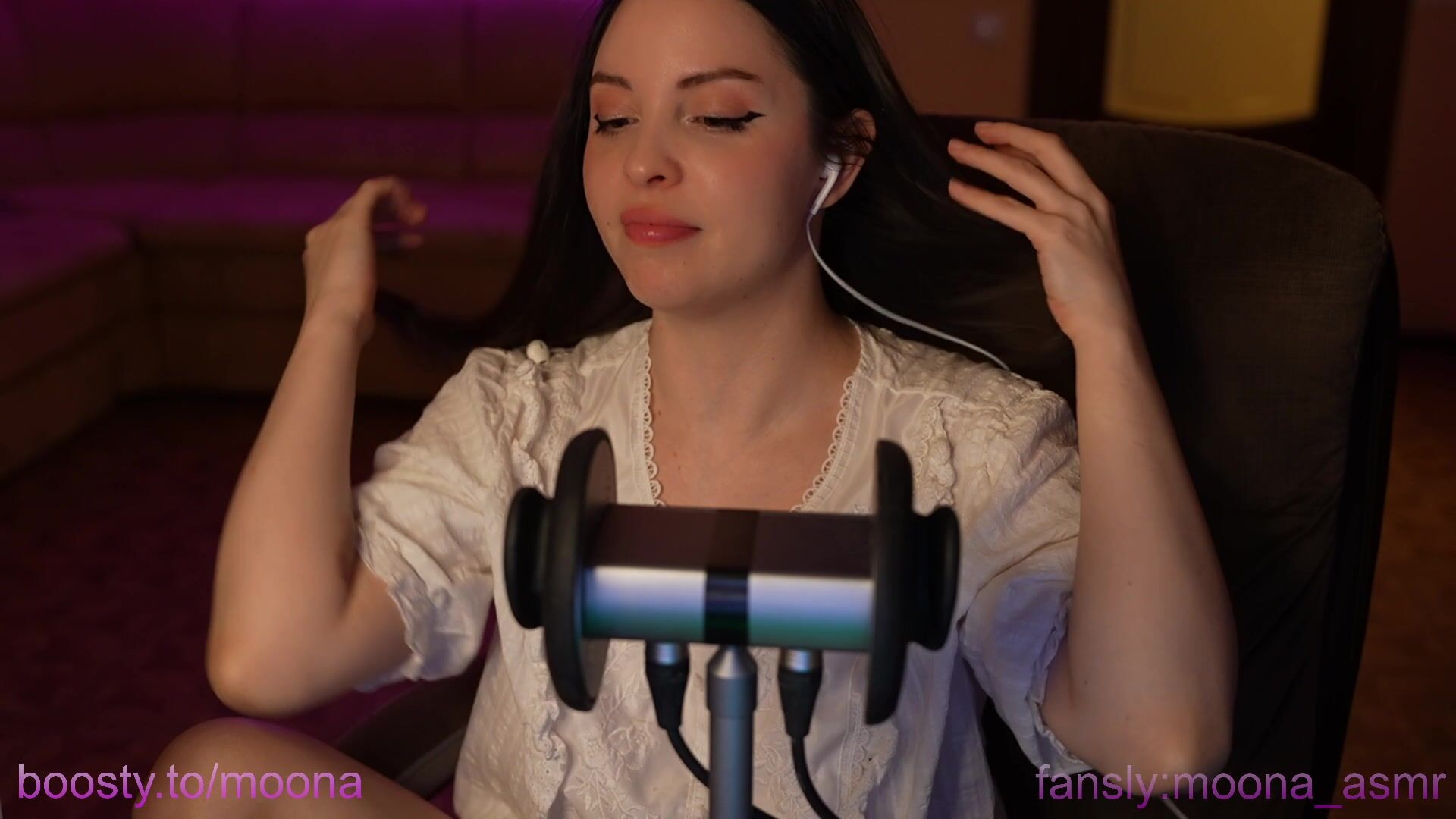Dive into Moona__Moona's Fansly ASMR video where she teases with a mic, creating intimate whispers and soft sounds in a cozy setting, perfect for unwinding.