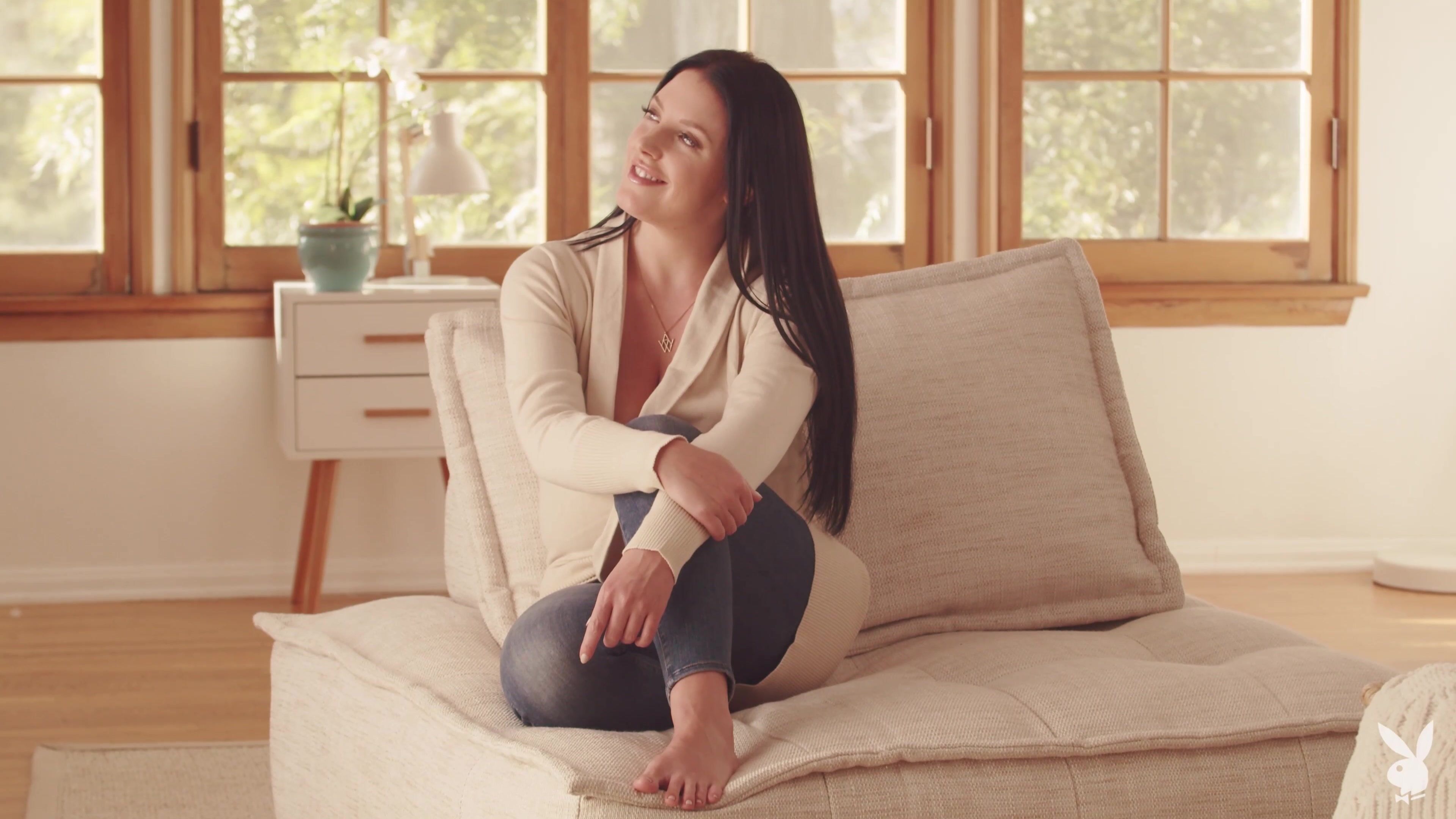 Angela White Strip Teasing in Hot Lingerie on Couch Video